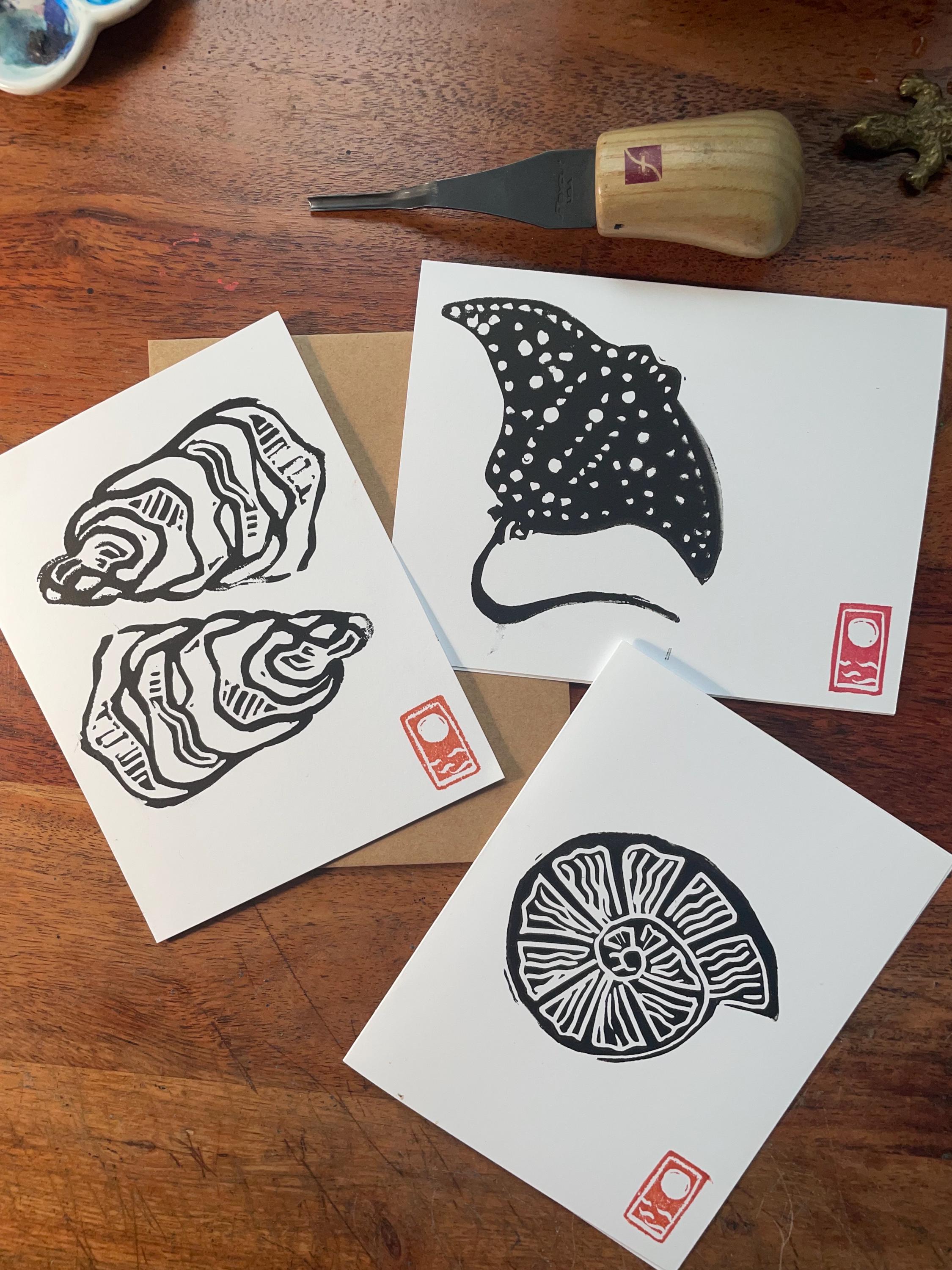 Each card is hand-printed using linocut techniques, created in my small studio in Fairhaven, Maryland. Printed on 60 lb matte card stock, each card measures 5.5 x 4.5 inches, is blank inside, and comes with a matching envelope.